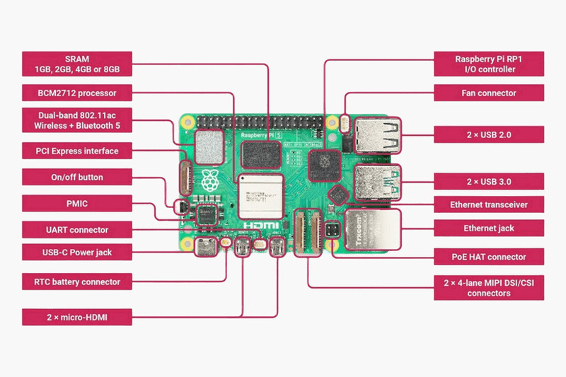 Нове оновлення лінійки міні-комп'ютерів Raspberry Pi Foundation. Нове покоління відрізняється вдвічі більш високою швидкодією та розширенням асортименту та кількості портів вводу-виводу. Комп'ютер побудований на новому ARM-процесорі Cortex-A76 із частотою 2.4 ГГц (у попередній моделі процесор Cortex-A72 працював на частоті 1,5 ГГц) з 8 ГБ LPDDR4X-4267 SDRAM оперативної пам'яті. Є також новий південний міст, що дозволяє збільшити пропускну спроможність інтерфейсу USB3, а також нове графічне ядро - GPU VideoCore VII, що працює на частоті 800 МГц (на відміну від 500 МГц у VideoCore VI Pi 4). Приємним доповненням стала наявність кнопки включення, яка була відсутня у всіх попередніх моделях.
